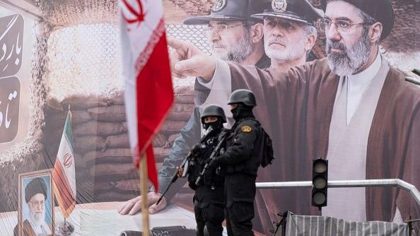 Two armed police officers stand guard in front of a giant banner depicting a portrait of Iran’s new Supreme Leader, Ayatollah Mojtaba Khamenei, and military commanders during a rally commemorating International Quds Day, also known as Jerusalem Day, in Tehran, Iran, on March 13, 2026 – Morteza Nikoubazl/NurPhoto via Getty Images